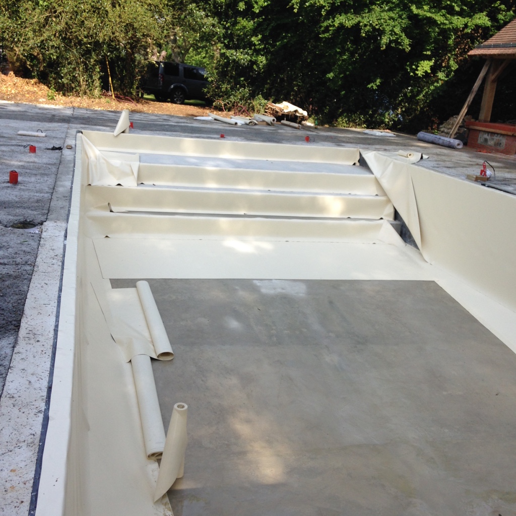 La membrane en PVC armé 150/100 ème, confectionnée sur place, est conçue pour les bassins de formes compliquées et qui ne rentrent pas forcément dans les standards.